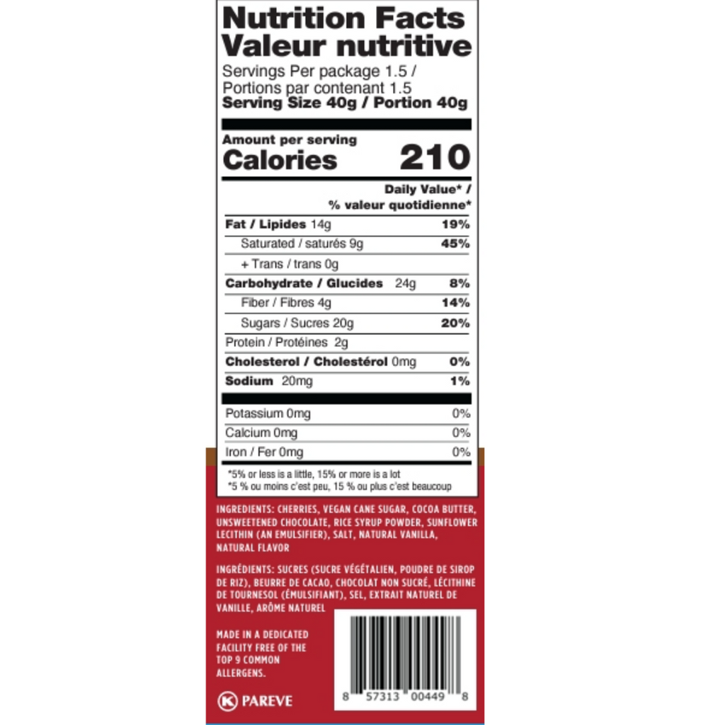 Cherries, Vegan Sugar, Cocoa Butter, Unsweetened Chocolate, Natural FlavorNutritional Facts: 2 serving per container, serving size (40g), Calories 190, Total Fat 7g, Cholesterol 0mg, Sodium 3.5mg, Total Carbohydrates 28.5g, Protein 1g.