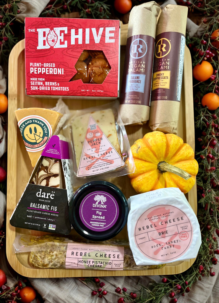 Deluxe: 6 Vegan Cheeses, 3 Vegan Meats on Wooden Tray